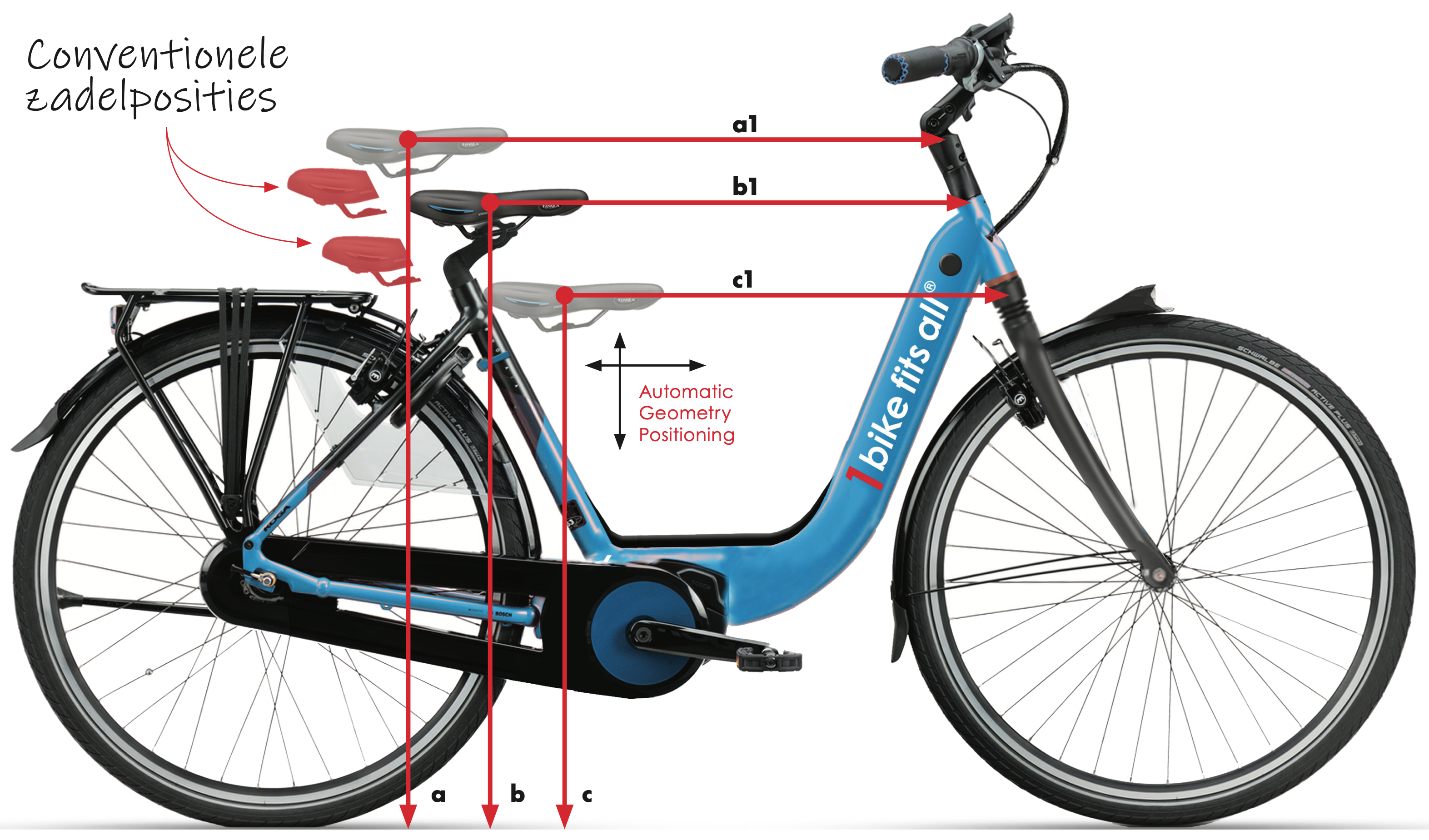 Durch dieses einzigartige Sitzkonzept kann der Sattel so eingestellt werden, dass immer ein gutes Verhältnis zwischen Sattel, Lenker und Pedalen besteht. Dadurch kann der Fahrer beim Anhalten immer beide Füße auf den Boden stellen und auf dem Sattel sitzen bleiben, selbst bei einer Notbremsung. Sicherheit für alle dank dem Automatic Geometry Positioning (AGP).